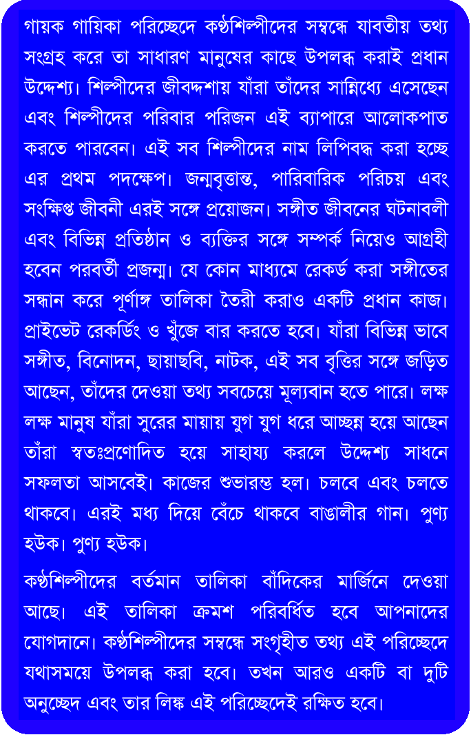 The list of vocal artists shown in the left margin is the starting point. This section is dedicated to the purpose of compilation of a comprprehensive list through contribution and participation of the public. If you want to add any name to the existing list, kindly fill up the form below and proceed.